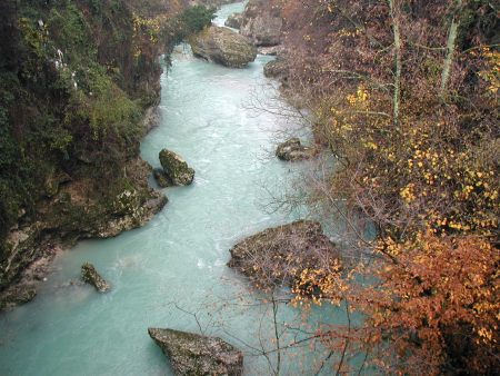 Il ponte Napoleonico, Napoleonov most. Qui troviamo la prima forra, elemento che caratterizzerà questo fiume. Dopo questo breve tratto di acque profonde il letto del fiume si allarga notevolmente come possiamo vedere nella foto sotto. |